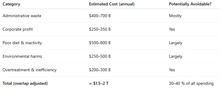 Analyses from JAMA, the Commonwealth Fund, and others suggest 25–30 percent of total health spending — about $1 trillion to $1.5 trillion — goes to administrative overhead, redundant billing, marketing, and price inflation.